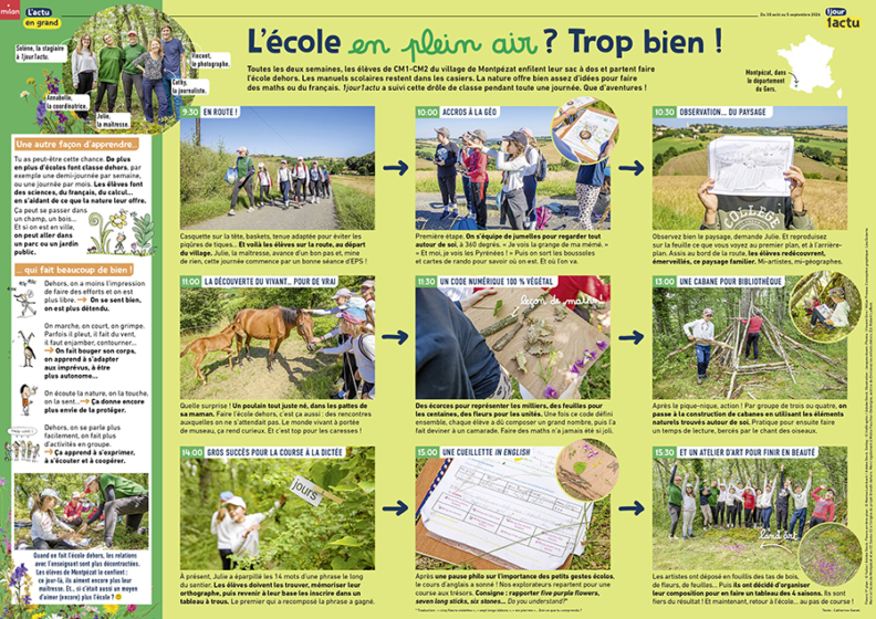 L'école dehors ? On en entend parler mais en quoi cela consiste vraiment ? Réponses dans le reportage publié dans 1jour1actu, qui pendant une journée, a suivi la classe de CM1-CM2 du village de Montpézat. Découvrez comment les élèves profitent de la nature pour faire du sport, des sciences, de la dictée, de l'art et même de l'anglais... De bonnes idées à piocher ! À lire ! Le reportage offert ! 1J1A_441_poster_ecole-dehorsTélécharger
